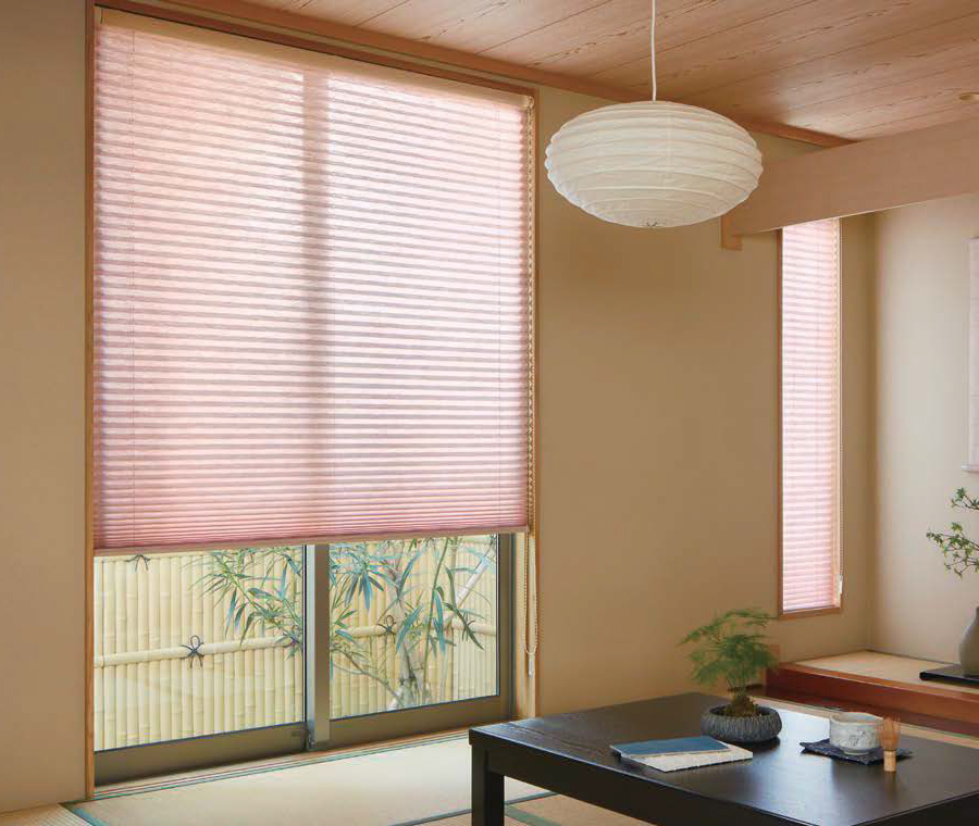 プリーツスクリーンひじりは光を和らかく映す、温かみのある和紙調の生地。春の訪れを感じさせるような優しいカラーを揃えました 。ニチベイのプリーツスクリーン「もなみ」シリーズ(M5025 M5026 M5027 M5028 M5029)