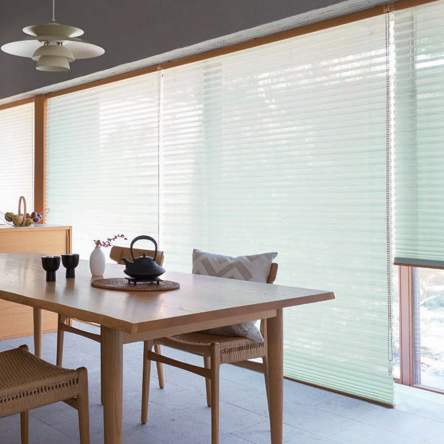 プリーツスクリーンデリス遮熱は光を和らかく映す、温かみのある和紙調の生地。春の訪れを感じさせるような優しいカラーを揃えました 。ニチベイのプリーツスクリーン「もなみ」シリーズ(M5187 M5188 M5189 M5190 M5191 M5192)