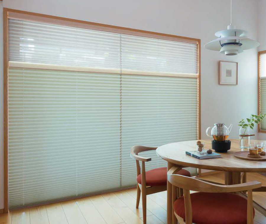 プリーツスクリーンシエノス遮熱は光を和らかく映す、温かみのある和紙調の生地。春の訪れを感じさせるような優しいカラーを揃えました 。ニチベイのプリーツスクリーン「もなみ」シリーズ(M5119 M5120 M5121)