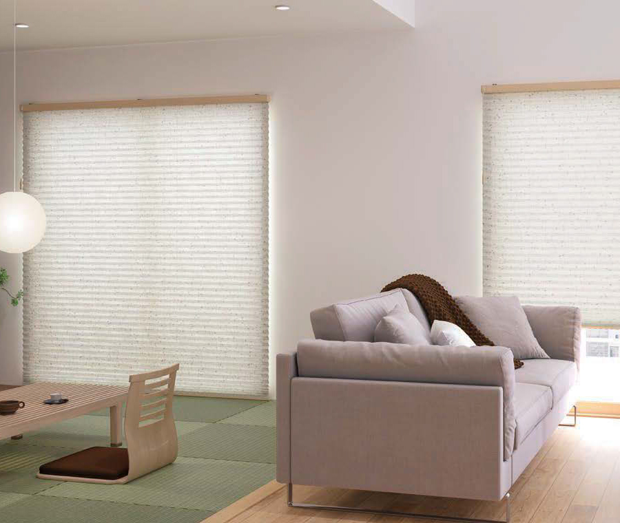 プリーツスクリーンサザレは光を和らかく映す、温かみのある和紙調の生地。春の訪れを感じさせるような優しいカラーを揃えました 。ニチベイのプリーツスクリーン「もなみ」シリーズ(M5124 M5125)