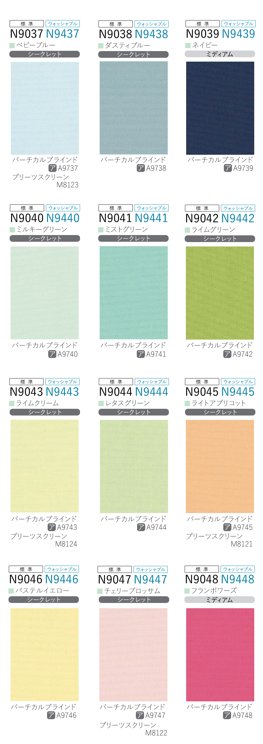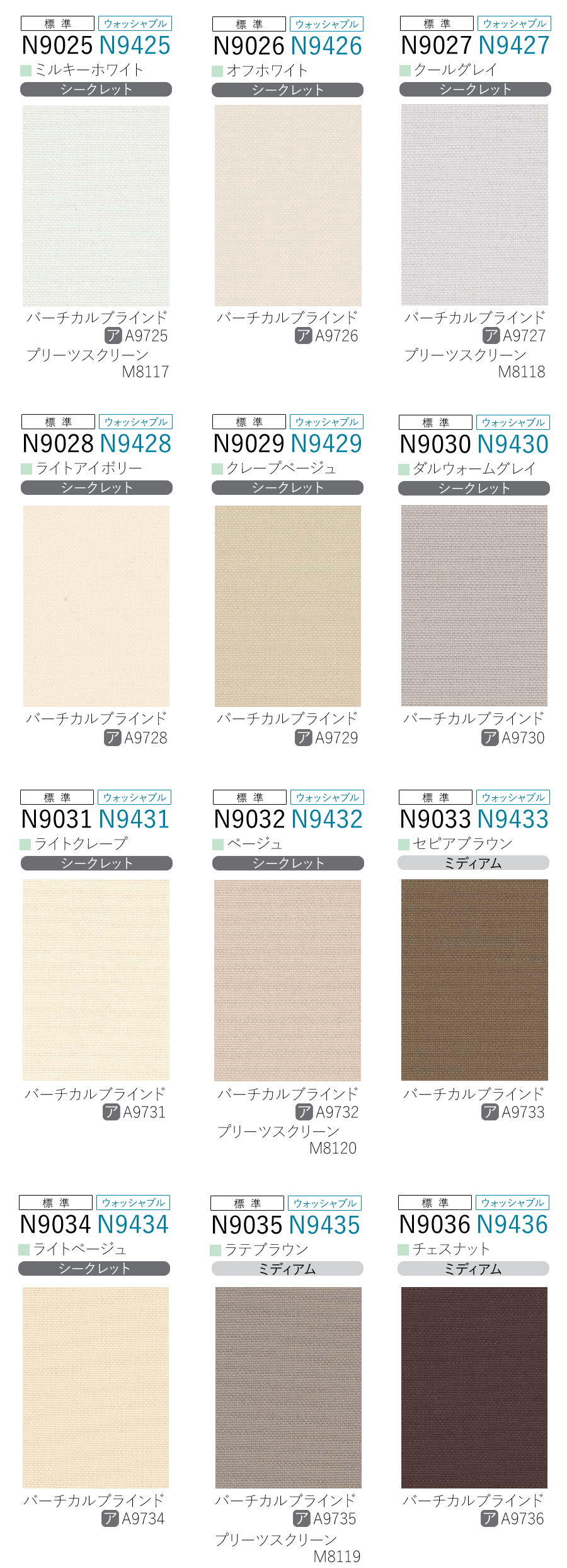 生地の透過度(シースルー、ミディアム、シークレット、遮光)等についてはこちらをご覧ください